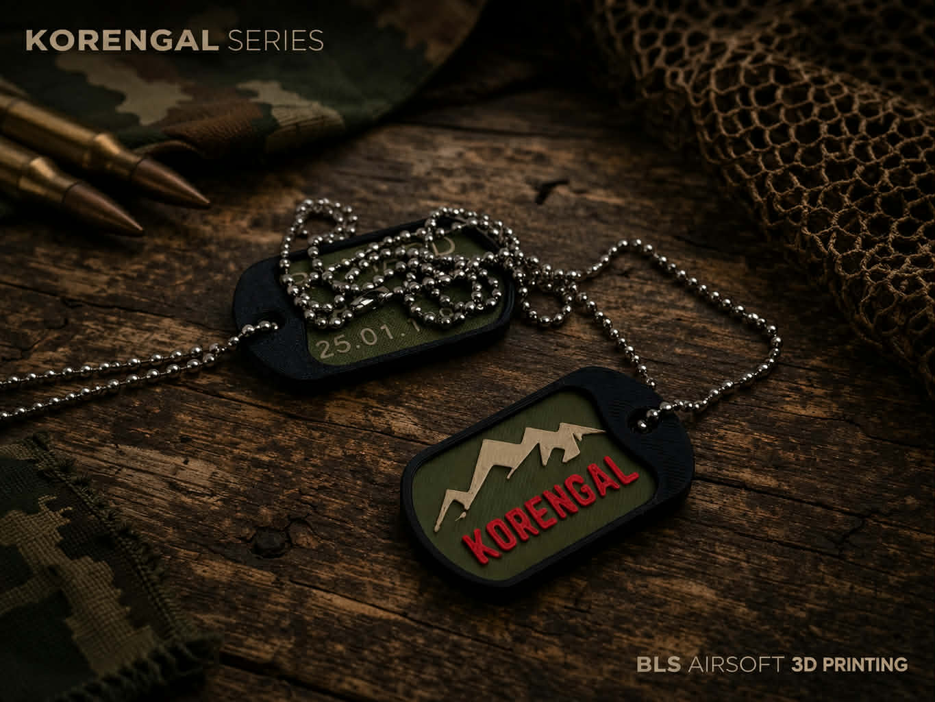 A klasszikus katonai azonosító modern, 3D nyomtatott változata, amely a Korengal IV esemény hivatalos stílusjegyeit hordozza. Matt fekete keretben, olívzöld alapon vörös és homokszín feliratokkal készült, így minden taktikai felszerelés hiteles kiegészítője.